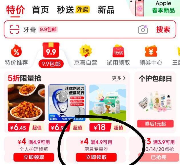 京东-9.9包邮-领4.9-4厨具券